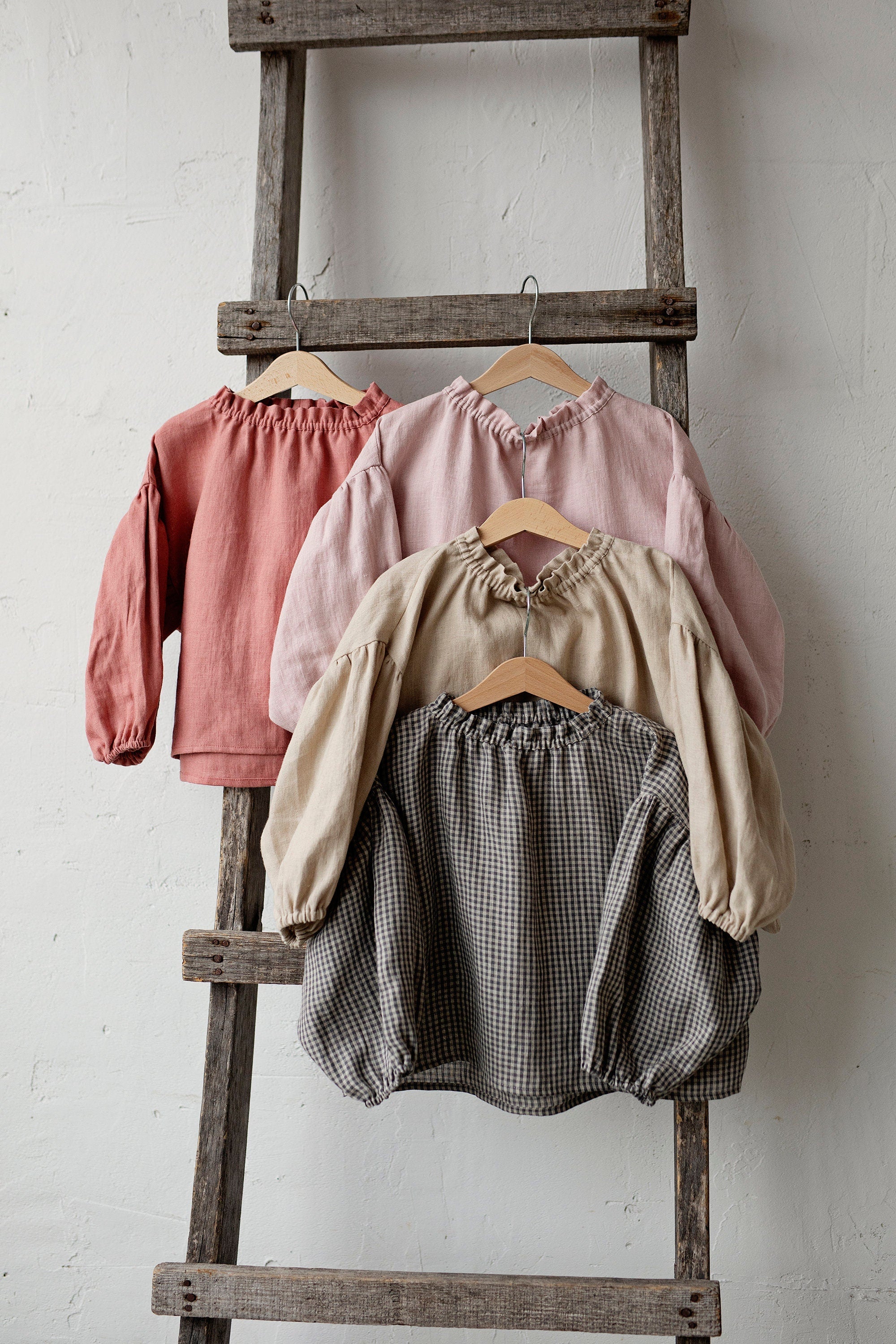Parachute tunic shirt with long puff sleeves and ruffled neckline is made of 100% soft medium weight linen.